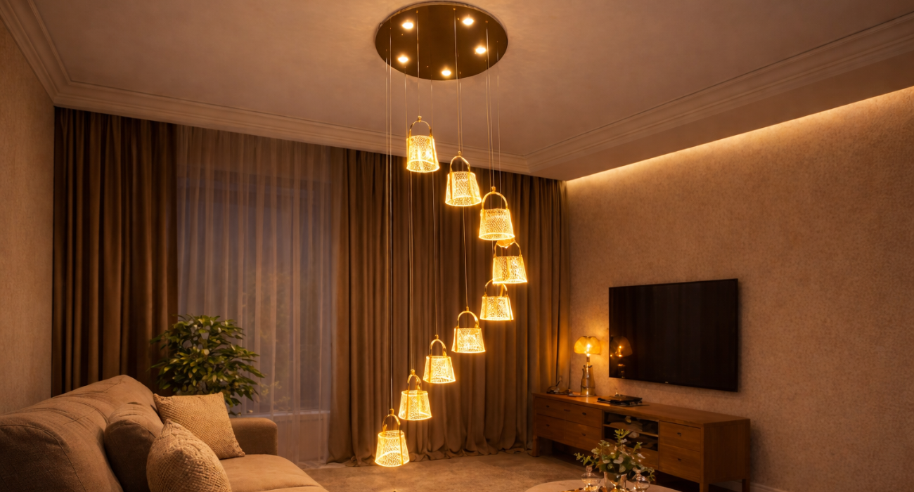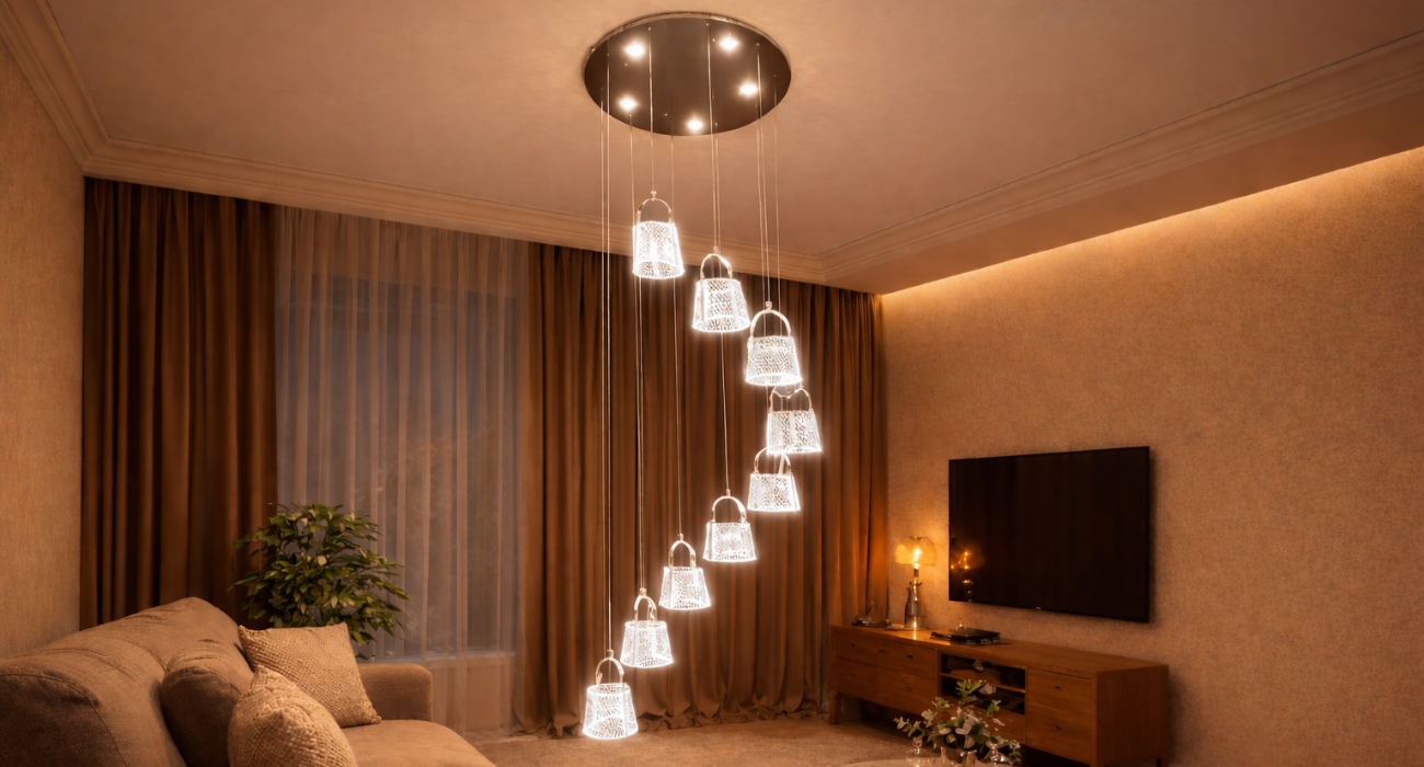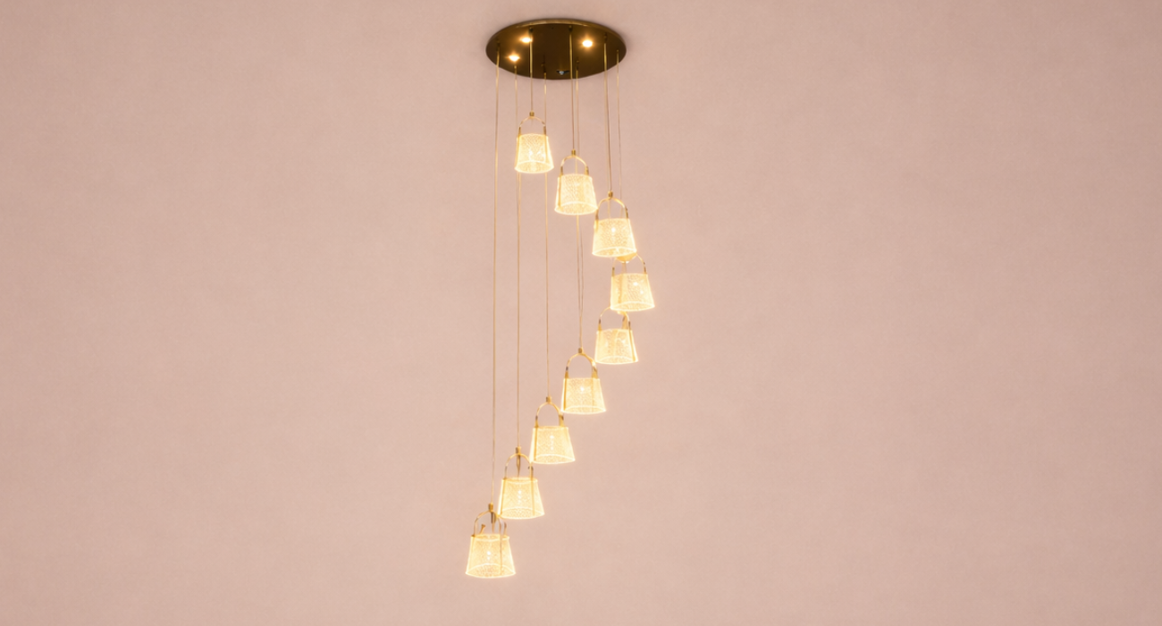 This 3-in-1 color double-height hanging light is designed to make a bold yet elegant statement in modern interiors. Featuring a cascading arrangement of finely crafted pendant shades, it creates a stunning visual flow ideal for double-height living rooms, staircases, hotel lobbies, and luxury villas. The fixture supports three light color options (warm, neutral, and cool white), allowing you to easily adjust the ambience to suit different moods and occasions. With its premium metal finish, refined detailing, and adjustable hanging lengths, this light combines functionality with contemporary aesthetics, delivering both decorative impact and balanced illumination for spacious interiors.