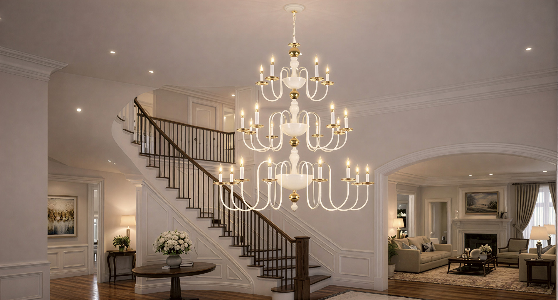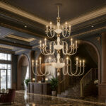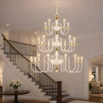 Make a grand statement with this luxurious multi-tier double height, designed to elevate double-height spaces with timeless elegance. Featuring a refined white and gold finish and beautifully curved arms, this masterpiece is compatible with E14 bulb holders, allowing you to choose decorative, LED, or warm filament bulbs for a customized glow. Perfect for foyers, staircases, living halls, and hotel lobbies, its impressive vertical design enhances architectural drama while delivering balanced, ambient illumination. A true blend of classic charm and modern functionality, this chandelier transforms any space into a sophisticated showcase.