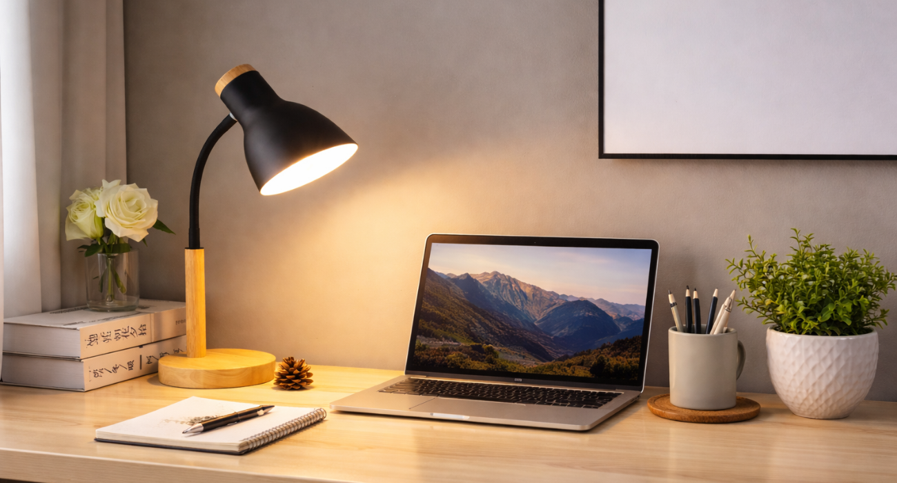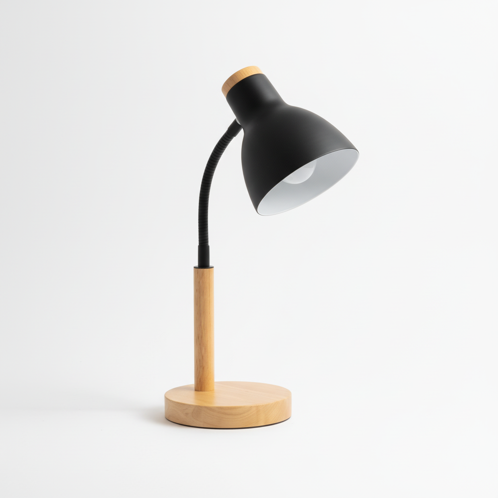 Enhance your workspace with a clean, minimalist aesthetic. This lamp combines a sturdy light-wood base with a sleek black matte shade, creating a striking contrast that fits perfectly into contemporary interiors.