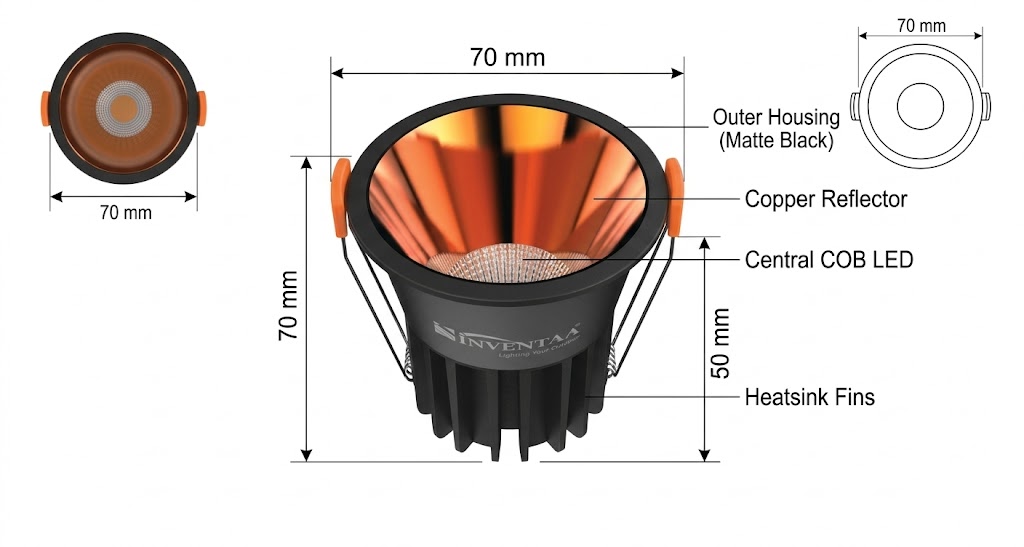 Experience powerful and refined illumination with the OXANA REFLECTOR COB Down Light from Inventaa. Engineered with a high-quality reflector design, this downlight ensures maximum brightness, focused beam control, and minimal glare, delivering superior visual comfort.