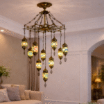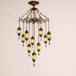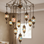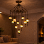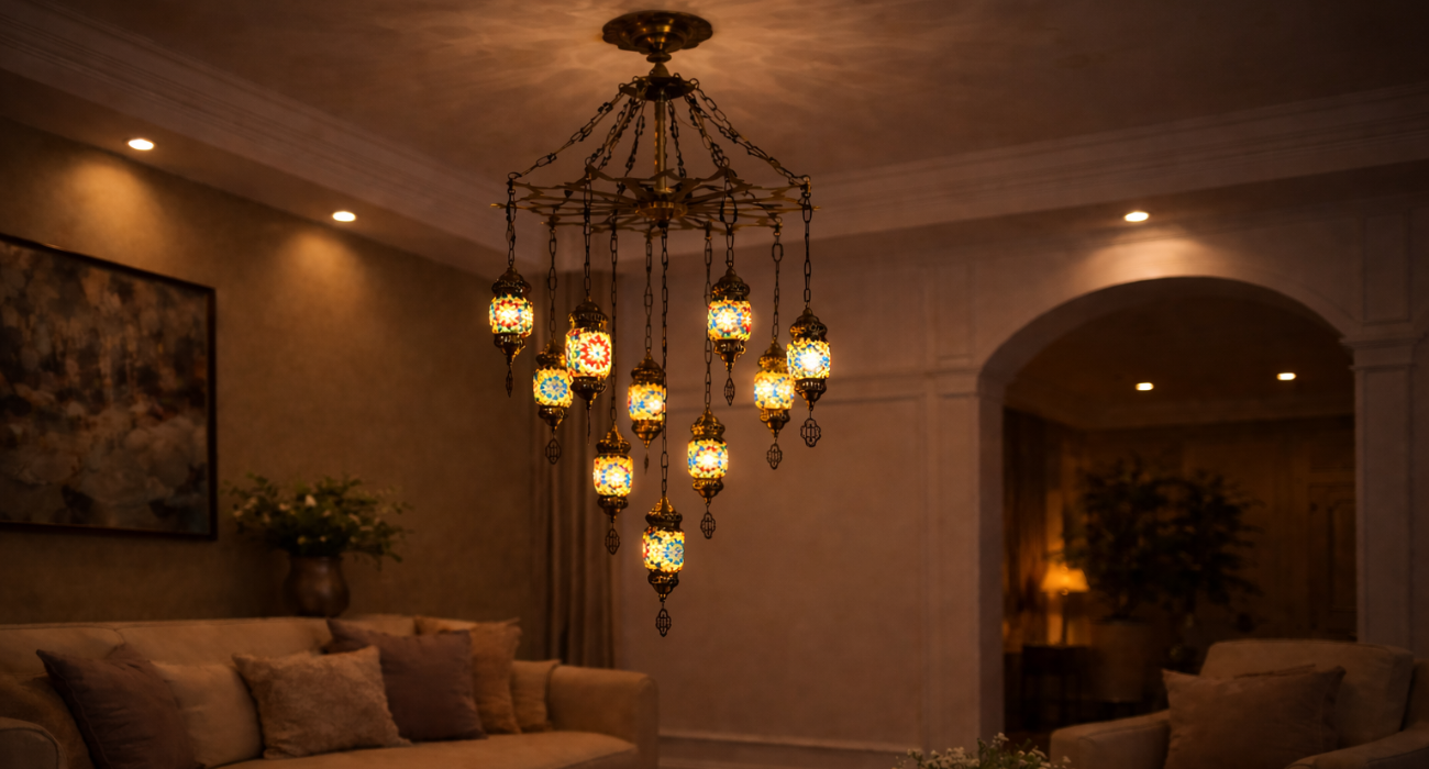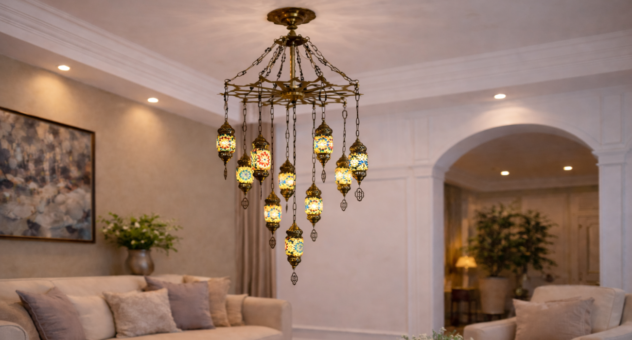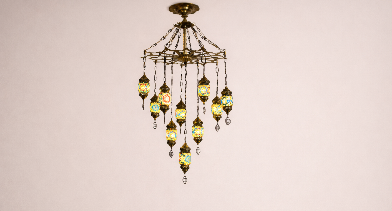 Enhance your interior with this elegant Turkish designed to bring warmth, color, and luxury to any space. Featuring multiple handcrafted mosaic glass lanterns suspended from a premium metal frame, this chandelier creates a stunning visual centerpiece for living rooms, bedrooms, dining areas, hotels, and cafés.