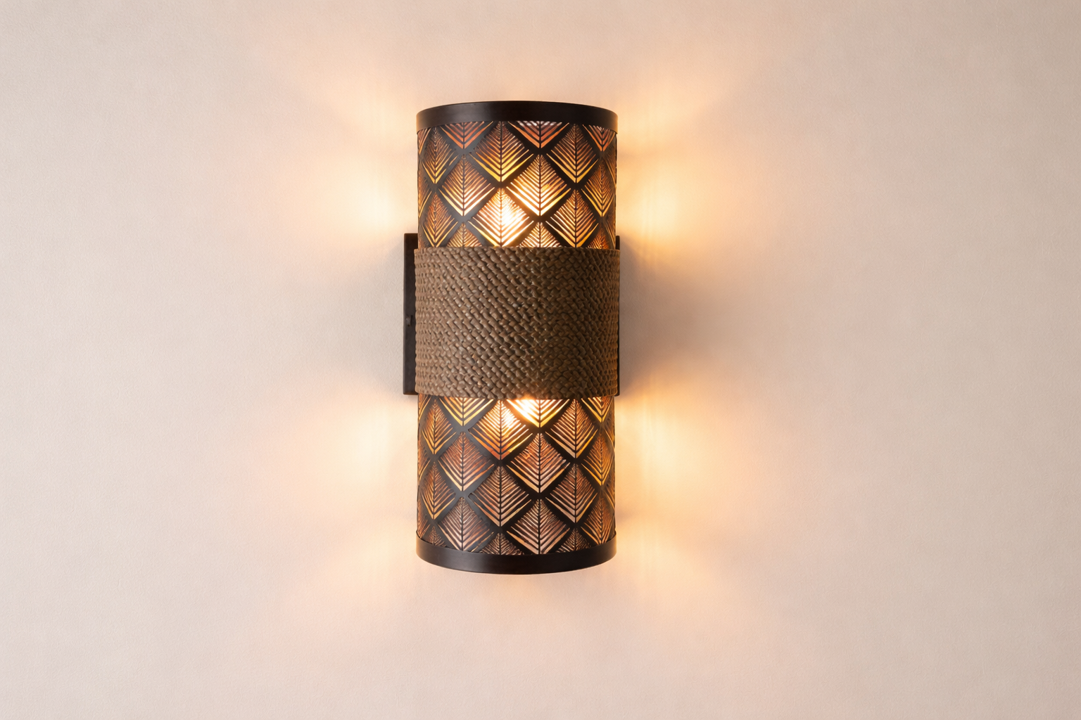 Create dramatic, ambient lighting with this elegant vertical wall sconce. Crafted from durable steel and sophisticated acrylic, this piece features a unique two-part design: an outer laser-cut acrylic layer with a precise geometric pattern that casts beautiful, patterned light, and a contrasting, textured central band. The up-and-down lighting design powerfully projects soft light both above and below the fixture, making it perfect for illuminating hallways, framing doorways, or adding a touch of drama to a living room wall. This sconce combines rich texture, warm light, and modern materials for a truly captivating effect.