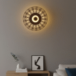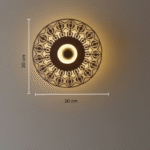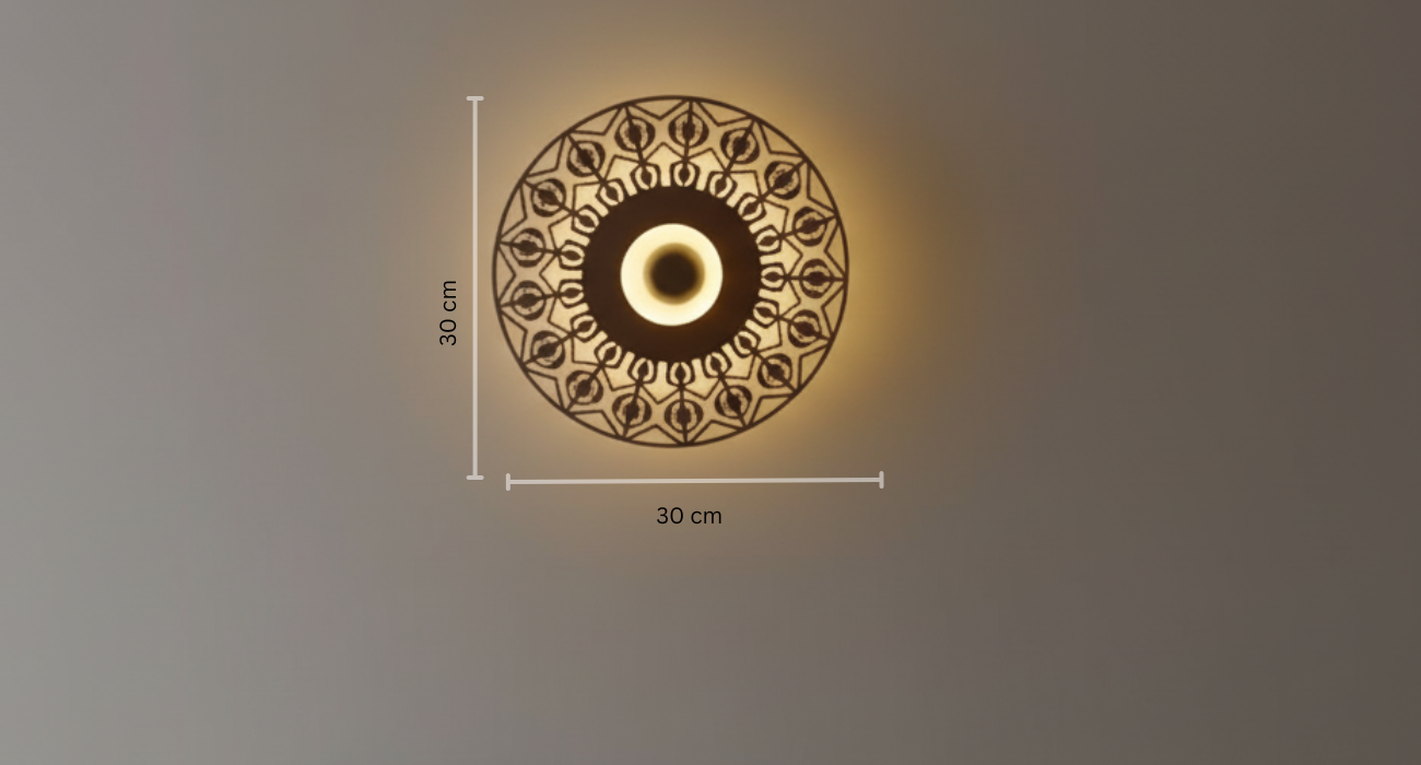 This image features an elegant and contemporary LED wall sconce mounted against a neutral-toned wall. The fixture is circular and showcases a striking, layered design. An outer ring of dark metalwork features an intricate, geometric pattern reminiscent of a mandala or Moorish design, providing a sharp contrast and strong visual texture. At its core, a central light source emits a warm, soft white glow that highlights the texture of the wall and creates a beautiful halo effect around the entire piece. The light shines through a small, textured, inner diffuser, drawing the eye to the center while the surrounding metal pattern casts subtle shadows, lending a sophisticated and ambient feel to the space.