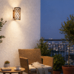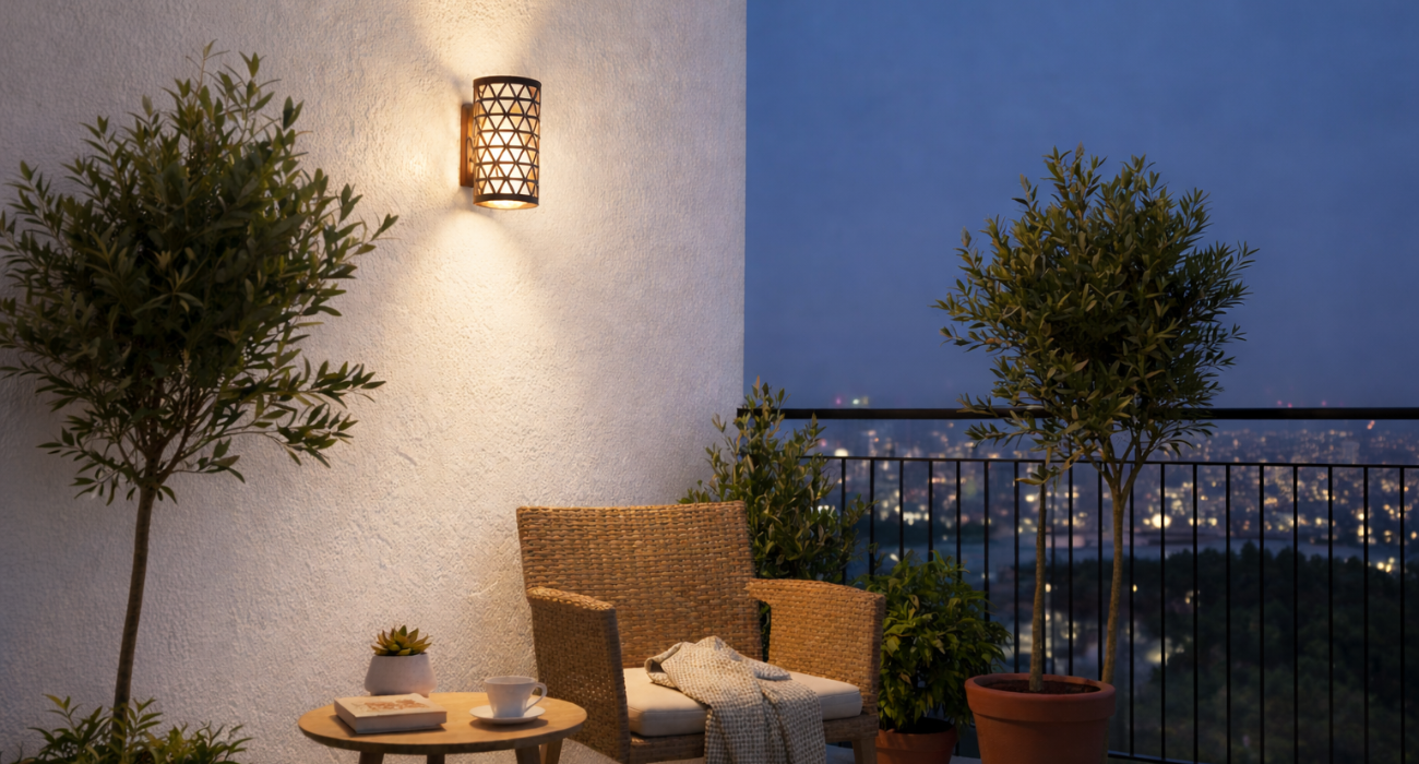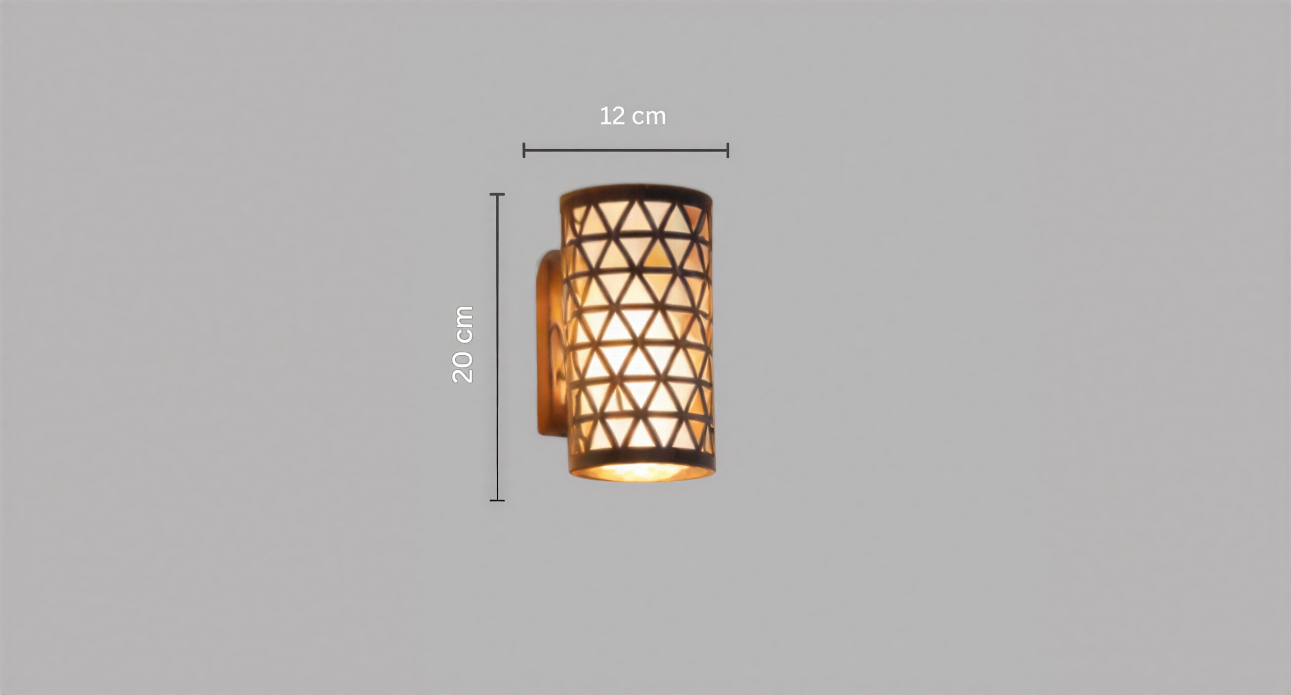 This unique cylindrical wall sconce brings a captivating blend of industrial geometry and organic charm to any space. Crafted entirely from durable steel, the fixture features a modern open-work design with an intricate geometric pattern of repeating triangles that forms the outer shade. The dark finish of the steel creates a striking contrast with the soft light diffused from within, casting beautiful, textured shadows when illuminated. The playful addition of artificial or simulated greenery draped over the shade introduces a refreshing, biophilic element, making this sconce perfect for indoor or outdoor settings that seek a contemporary yet nature-inspired aesthetic.